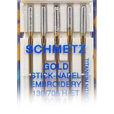 Use When Embroidering Through Adhesive Stabilizers and Fusible Webs Schmetz Embroidery Gold Titanium Embroidery needles have a unique Titanium Nitride ceramic outer coating that resits wear and stays sharp and usable up to five times longer than traditional embroidery needles. Schmetz Embroidery Gold Titanium Embroidery needles also offer a sharp point and a specially designed eye and scarf to minimize thread abrasion during the embroidery process, virtually eliminating thread strip-back and breakage. Available in sizes 75 & 90. System 130/705 H-ET: With slightly rounded point and enlarged eye. Titanium Nitride coating improves needle wear resistance in high stitch count applications and reduces needle clogging. For embroidery and coarse and densely woven materials.